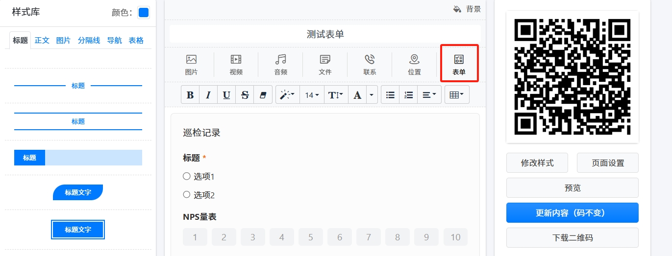点击模板中的表单,右侧出现表单设置,可以设置为展开模式,即扫码后就显示表单内容