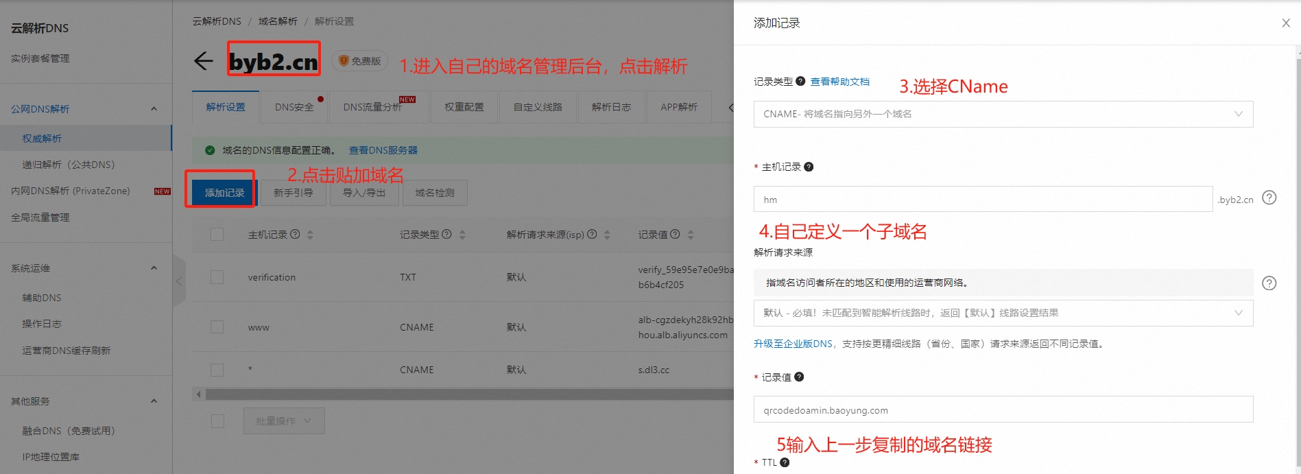 登录域名服务商后台,设置CName,如阿里云例子