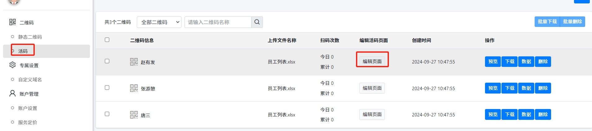 从【活码】-【管理二维码】进入二维码列表