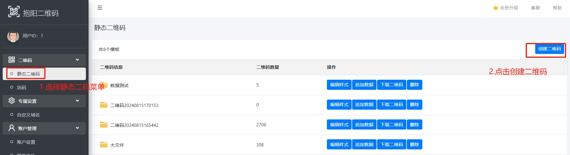 - 选择左侧菜单中的【二维码】-【静态二维码】
