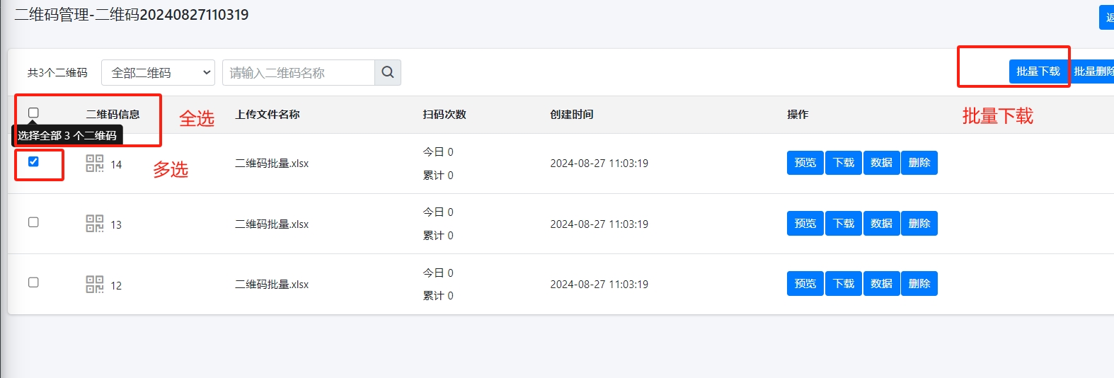 - 打勾要下载的二维码图片,或者点击全选按钮