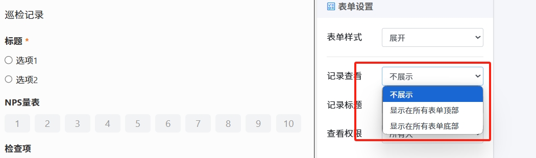 可以选择在模板中显示表单数据查看的入口,和显示的位置